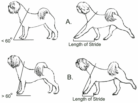 Dog B. has trouble extending his front legs. Because of the steep shoulder, he needs to lower his head to gain effective use of the muscles which move the leg forward. He will tend to “hang” on the leash to assist himself in getting the front end airborne. Left to his own devices, he will tend to move with considerable vertical bounce, and with a lower stationed head. Because of the shortened front stride, the rear will tend to kick up behind, rather than reach under the dog. This dog, if trained to tolerate being “strung up” on the leash, may look very flashy in the ring, as his handler helps him get his front off the ground, the rear is then free to propel him forward.