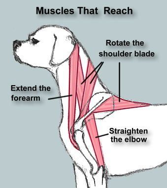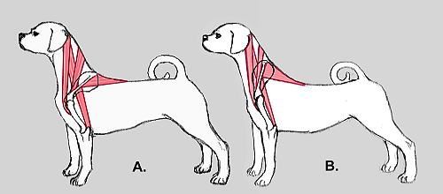 Look at the lack of balance in the musculature of the dog with an upright shoulder blade. The areas of attachment of the muscles are limited because the angles are too steep. The angles at which the muscles act limits their mechanical advantage as well.
